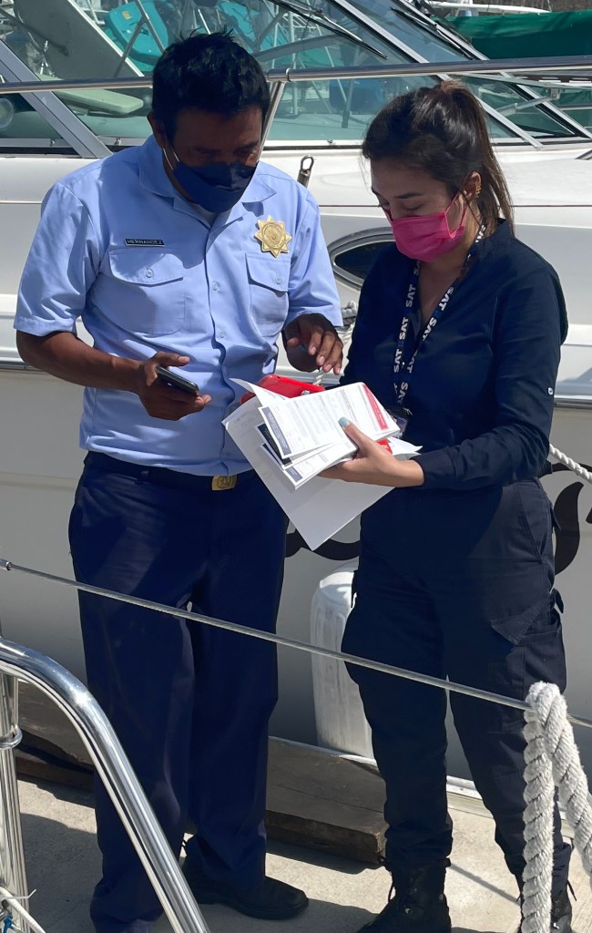 After another round of Mexican institutional corruption where two of our crew were fleeced for another $31 each we were finally granted permission to depart Mexico. The amiable customs agent and his charming assistant were friendly and professional which was a welcome change from our previous Mexican bureaucratic authority experiences. The assistant boarded Matilda for a brief, courteous inspection. Multiple papers were signed and stamped. Then we were cleared for a 3 o’clock departure. Unfortunately, the tide was not high enough for Matilda‘s 6.5’ draft so we had to wait about an hour for the rising tide to lift her off the muddy bottom. The truly unfortunate consequence of our late departure was that the assistant customs agent was made to stand on the dock in the hot sun and wait for us to leave. Evidently, a photograph of our departure is required and her colleague saw no reason they should both stand in the sun. She politely refused our offer of water or soda or engage in anyway with us despite our chivalrous attempts to aid her. She was kind enough to take our picture with one of our phones.