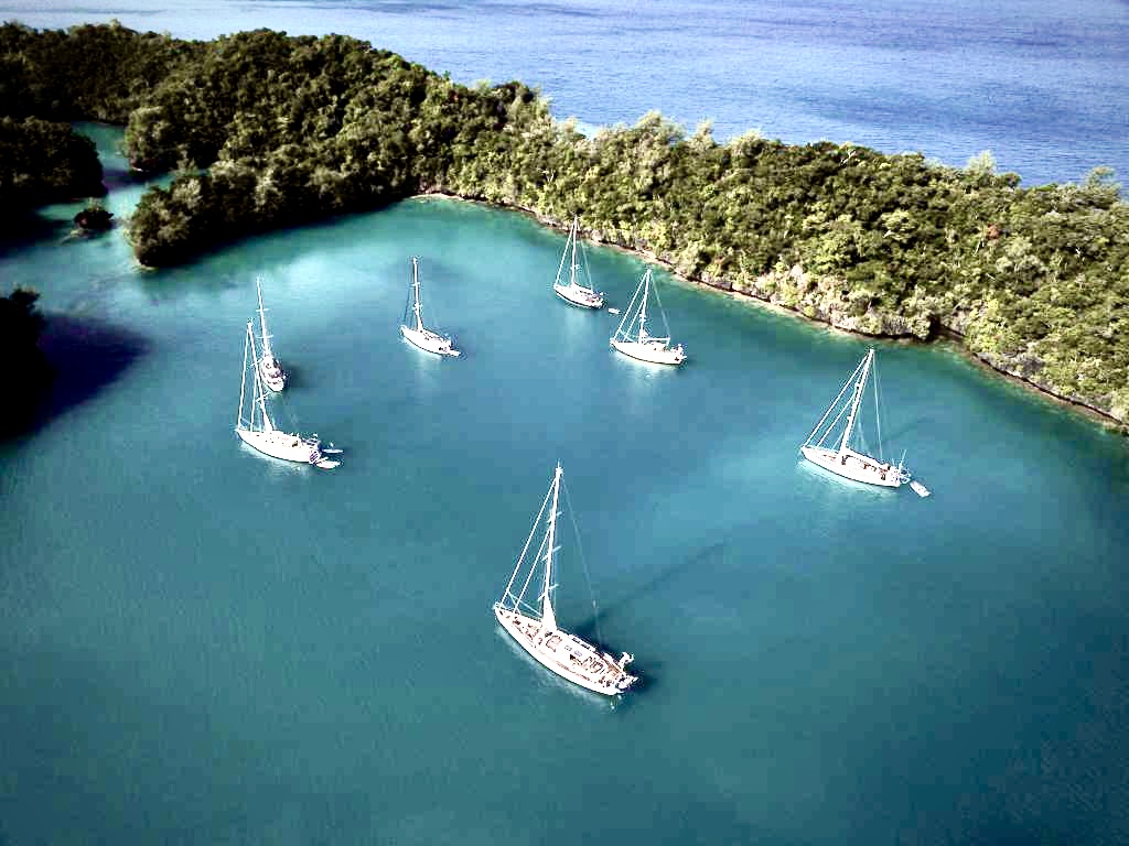 After freeing ourselves from the reef the three boats continued toward our anchoring destination single file at snail’s pace with spotters on the bows. Hoka Hey was in the lead followed by Amanzi with the gun-shy Matilda bringing up the rear. As we entered the Bay of Islands Amanzi took the lead. Mark, the skipper of Amanzi had carefully charted the approach to the anchorage with the most accurate, up-to-date charts. We watched as Amanzi crawled toward the anchorage and seemed to come to a stop when over the VHF comes Mark’s voice, “We are stuck”. Amanzi had run aground. Fortunately, the water inside of the bay was dead calm unlike the conditions when Matilda went aground. Amanzi was stuck fast and no amount of engine power was moving her. Mark’s wife Clare donned mask and fins and dove under Amanzi to have a look. She found that the very bottom of the keel was sitting atop a bommie. As the tide was coming in they decided to wait to be floated off. After about 30 minutes they were able to gently motor off the bommie.