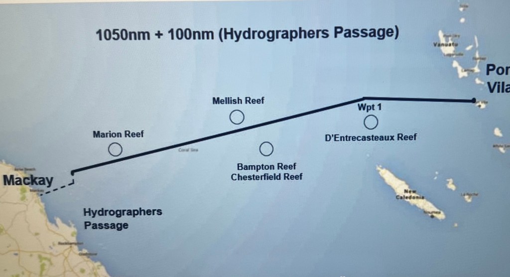 Bio security is apparently very strict in Australia so we need to have enough food for a 1000 mile passage but arrive with no food. Our preparations are in high gear as we make sure our boat is ready for this passage as we will have some squalls and multiple reefs to navigate through on our way to Mackay. Our route takes us through Hydrographers Passage in the Great Barrier Reef which was discovered in 1981 by a commander of the Royal Australian Navy named, believe it or not, James Bond. Taking this passage should save us about two days or 250 miles. Vast areas of the GBR remain uncharted making navigation treacherous.