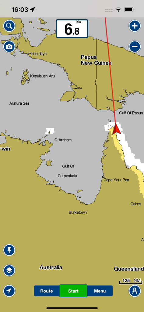 These were very tricky miles navigating through the Great Barrier Reef all the way up to the northern tip of Australia in the shipping channel dodging reefs and ships. After reaching the tip we needed to turn west through the Endeavor Strait  and head for Darwin across the Gulf of Carpentaria. The final stretch into Darwin was a challenge to follow the navigation channel through the Dundas Strait.